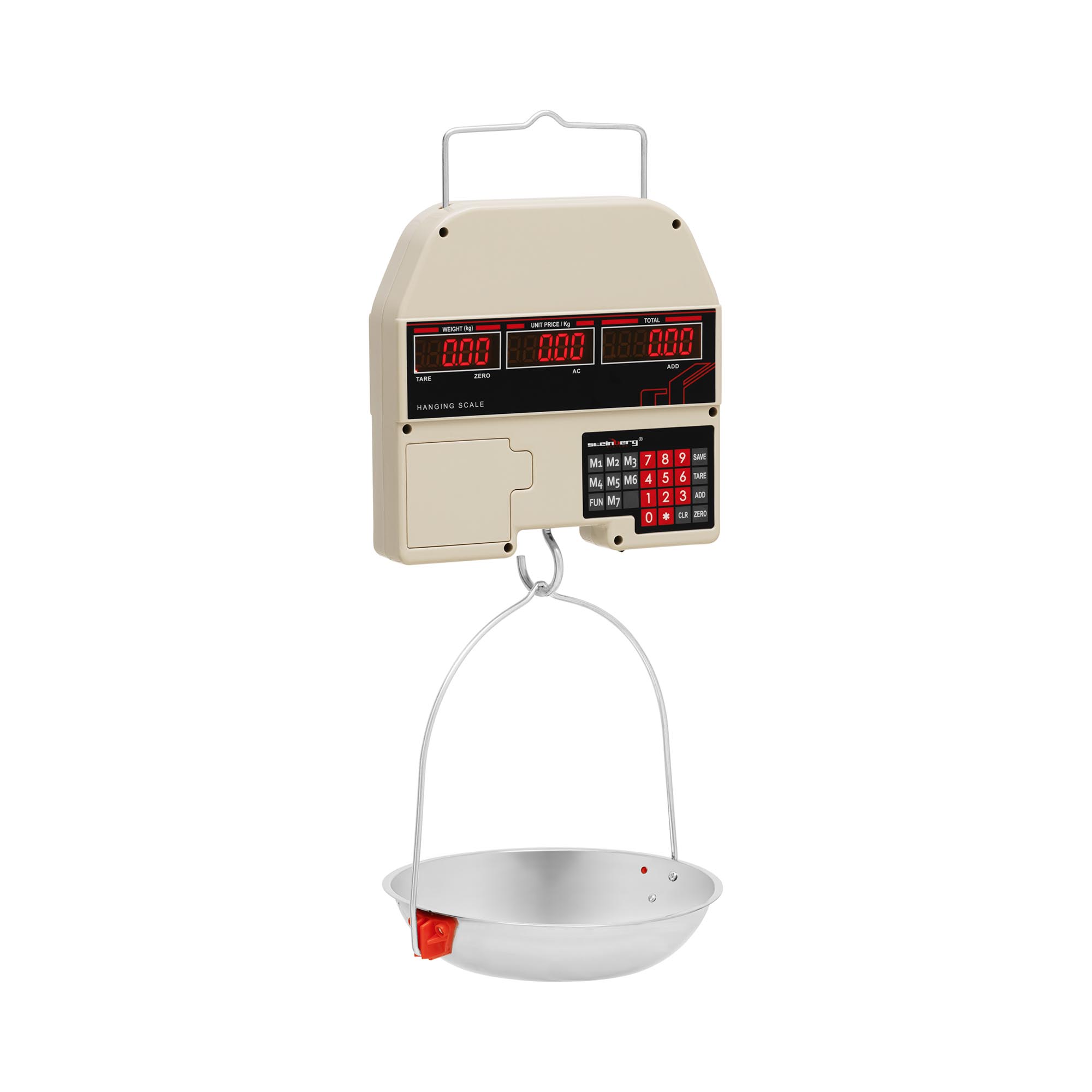 Az akasztós mérleg tökéletes minden alkalomra, amikor valamit meg kell mérni. Akár professzionális, akár privát használatra, az abszolút pontosságnak és a kiváló minőségű kivitelezésnek köszönhetően a mérleg bárhol ideálisan használható. A függőmérleg súlytartománya 0.1 – 30 kg. A mérések pontossága 0,005 kg. A mért értékek kg-ban vagy lb-ben jeleníthetők meg. Az árak kiszámításához és ellenőrzéséhez beállíthat egy kg-os árat, és ennek megfelelően számíthatja ki a teljes súlyt. Ehhez 7 memóriahely áll rendelkezésére, amelyekkel egy gombnyomással kiválaszthatja a kg-onkénti árat. A mérleggel nem csak az árakat mérheti vagy ellenőrizheti, hanem több mérés eredményét is összeadhatja, vagy nullázhatja azokat, így például a tartók nem kerülnek mérésre. A súly, a kilogrammonkénti ár és a lemért súly ára mindig látható az előlapon található három LED kijelzőn. A hátoldalon három LED kijelző áll a vásárló rendelkezésére. Az újratölthető akkumulátorral felszerelt mérleg akkumulátor-élettartama 40 óra. Az energiatakarékos módnak köszönhetően az akkumulátor rendkívül sokáig bírja. A rozsdamentes acélnak köszönhetően az ipari mérleg magas színvonalú, tartós, és stabil. A felhasznált anyagok kidolgozása kiváló minőségű, amely megfelel a legmagasabb ipari sztenderdeknek.