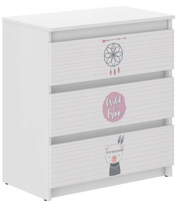 Olyan ajánlatot hozunk, amelyben gyönyörű komódokat találsz fiúknak és lányoknak. A mesebeli motívumok, minőségi anyagok, gyönyörű színek minden gyerekszobát egy kis mesevilággá varázsolnak. Kínálatunkban szereplő összes gyermek komódot úgy terveztük, hogy biztonságos és egyben esztétikus legyen. Nem csak mesésen szép, hanem kiváló minőség is!A komód fehér forgácslapból készült, felületkezelt furnérral. A vezetőkre szerelt fiókok ütközőkkel vannak ellátva, hogy megakadályozzák azok teljes kihúzását. A színes nyomattal ellátott komód elülső része szép élénk színekkel rendelkezik, és speciális laminált anyaggal van rögzítve, hogy ne fakuljon és kopjon. Kendővel és vízzel tisztíthatja. Műszaki adatok:Anyaga: laminált lemez és PVCFiókok száma: 3 dbSzín: fehér + nyomatA komód méretei: 76x40x70 cm (magasság x mélység x szélesség)