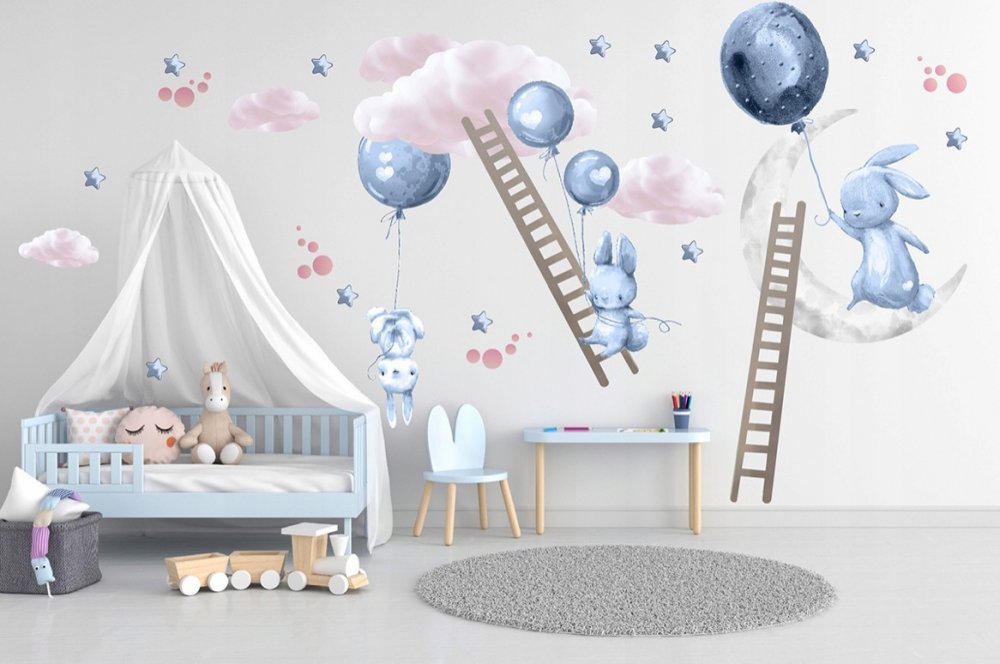 Gyerek falmatrica Nyuszik lufikkal 100 x 200 cm – Könnyen felhelyezhető és eltávolítható dekoráció, amely inspiráló motívumokkal díszíti a gyerekek kedvenc terét.