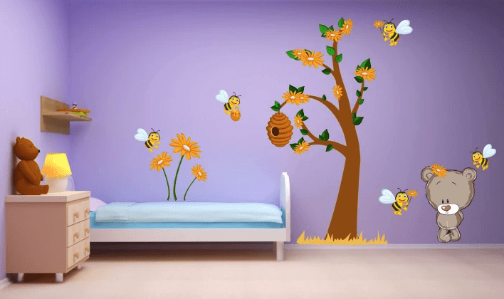 Gyerek falmatrica Szomorú mackó és méhecskék 100 x 200 cm – Színes és megnyugtató falmatrica, amely segíti a gyerekek érzelmi fejlődését, miközben feldobja a szoba hangulatát.