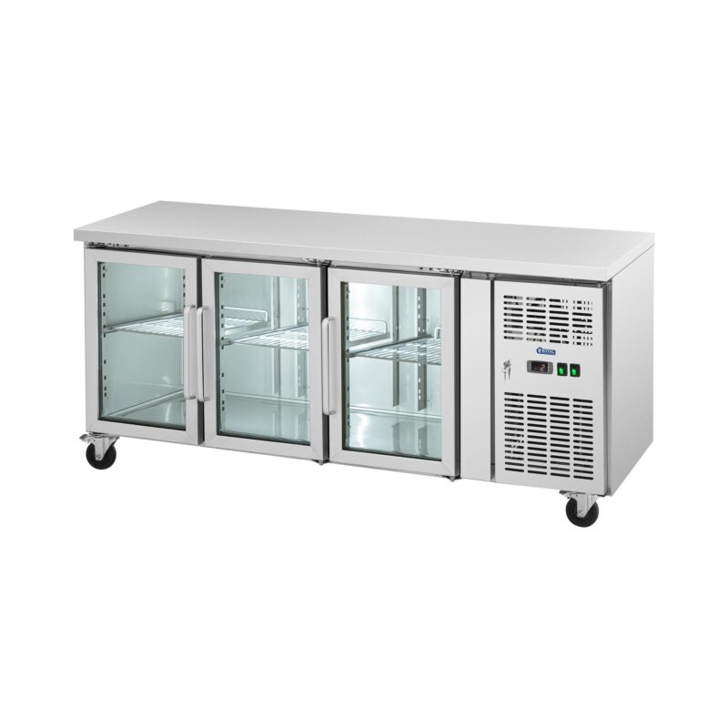 Hűtőpult kerekekkel – 410 l – 3 üvegajtó – 179,5 x 73 cm – B osztály – Rozsdamentes acél – Royal Catering