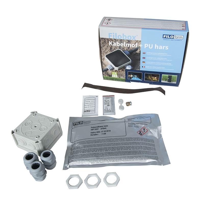 Akik vízálló csatlakozást szeretnének létrehozni a föld alatt, azok számára ez az öntőhüvely készlet kiváló vízálló csatlakozást biztosít. A kábeleket a kábeldobozban sorkapoccsal vagy forrasztóbilinccsel (nem tartozék) lehet egymáshoz csatlakoztatni. Az öntőgyanta beöntésével a kábeldoboz védve van a víz behatolásától. Ezáltal az elektromos csatlakozás teljesen vízálló és biztonságos. A kábeldoboz öntőgyantával történő feltöltése után azonnal beásható és áram alá helyezhető. Az öntőhüvely készlet teljes. A csomagban egyértelmű szerelési útmutató, valamint csiszolópapír és egyszer használatos kesztyű is található. Minden kábeldobozhoz 3 erős nejlon membrán tömítés és záróanyák tartoznak. A doboz 8 porttal rendelkezik 4 irányba. A kikeményedett öntőgyantát a normál háztartási hulladékkal együtt lehet eldobni. Ideális készlet a kültéri világítás megfelelő, egyszerű és biztonságos csatlakoztatásához.