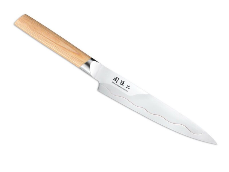 KAI japán konyhai használati kés 15 cm pengehosszal a Seki Magoroku Compositesorozatból, amelyaz egyszerűség és a dinamikus tulajdonságok kombinációja .A kés így kialakított megjelenése lenyűgöz minden szakácsot, aki egy dizájnos darabra vágyik. A könnyű fa markolattal kombinálva a sorozat rendkívül kényelmesnek és stílusosnak tűnik. A kompozit penge akár két különböző típusú acélból áll , amelyeket rézötvözettel lamináltak és ragasztottak össze. A Seki Magoroku kompozit késsorozat különleges elismerést kapott a 2013-as Red Dot Design Awardson.