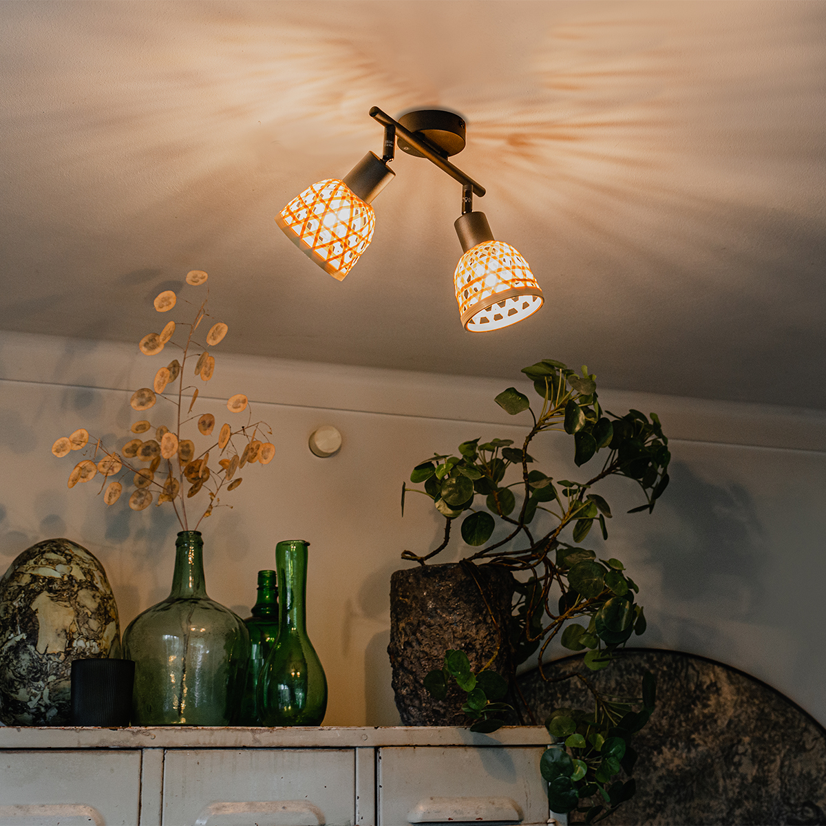 Ez a gyönyörű Rayan spotlámpa ragyogást kölcsönöz a belső térnek! A fekete acél és a bambusz spotlámpák kombinációjának köszönhetően tökéletesen illeszkedik az keleti stílusú belső térbe. A rács lehetővé teszi, hogy az izzó kiemelkedjen, és kellemes fényhatást hozzon létre a falon. A spotlámpa 2 különállóan állítható búrával rendelkezik, így Ön dönthet arról, hogy hová szeretné irányítani a fényt. Továbbá a Rayan magassága 21 cm, hossza 45 cm, szélessége 10 cm. A spotlámpát 2 LED izzóval lehet kiegészíteni, amelyek egy kis E14-es foglalatba illeszkednek, maximum 25 watt teljesítményig, amelyeket külön lehet megrendelni.