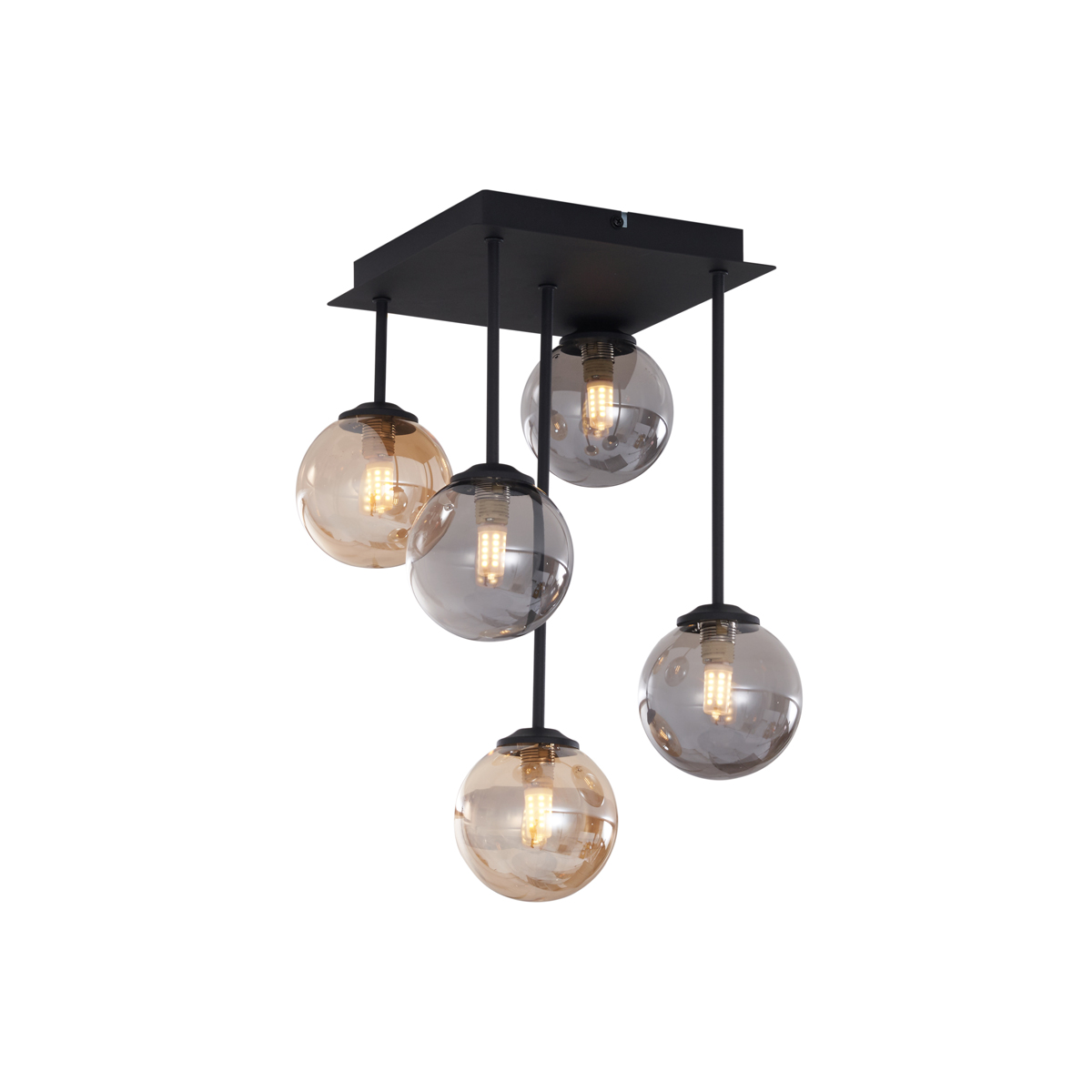 Modern mennyezeti lámpa fekete, borostyán és füstüveg kombinációjával, 5 fényforrással – Athén