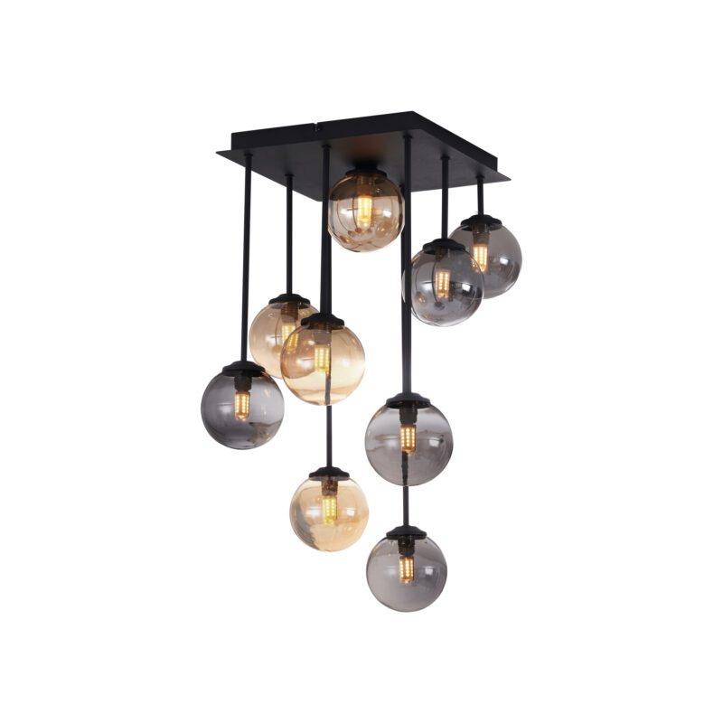 Modern mennyezeti lámpa fekete, borostyán és füstüveg kombinációjával, 9 fényforrással – Athén