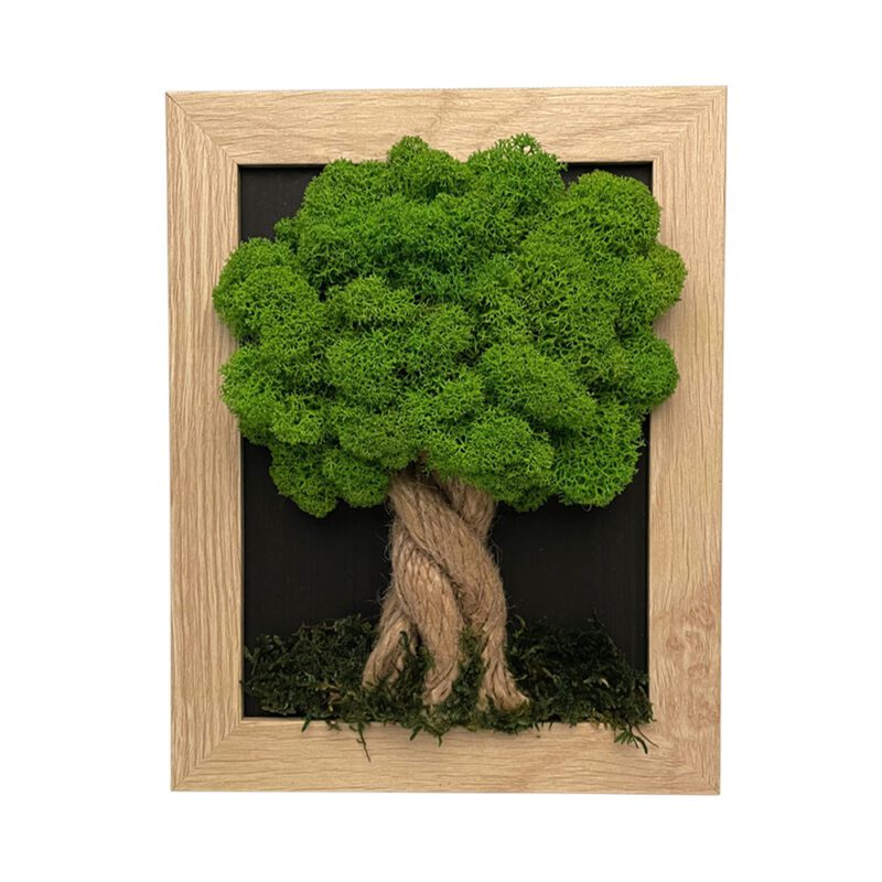 Mohakép – világos barna keret 19 x 24 cm – Környezetbarát és fenntartható moha dizájnelem, amely bármely térben nyugalmat és természetközeli megjelenést biztosít.