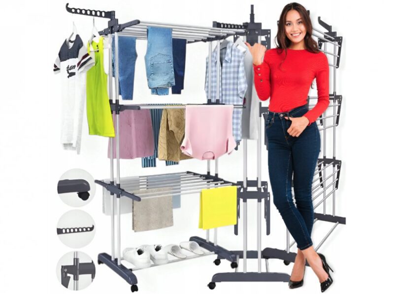 A ruhaszárító minden otthon nélkülözhetetlen eleme. A szabadon álló ruhaszárító kis helyet foglal el, mivel összehajtható és eltehető, ha befejezte a ruhák szárítását. A szárító kerekekkel rendelkezik, ami még praktikusabbá és kényelmesebbé teszi. Egyszerre három különböző szinten száríthatja a ruhákat. Az akasztókhoz forgó oldalsó kampók lehetővé teszik több ruha egyidejű szárítását. Összecsukható kialakítása ellenére a szárító akár 40 kg szennyest is képes tárolni.Specifikációk:Magassága: 170 cmSzélessége (akasztók nélkül): 72 cmMélység: 64 cmMélység (összecsukva, talp nélkül): 22 cmMélység (összecsukva, talppal): 50 cmA szerkezet oldalcsöveinek átmérője: 1,9 cmCsőátmérő: 1,3 cmCsövek közötti távolság: 3 cmSzintek közötti távolság: 45-53 cmKampók szélessége: 10 cmTerhelhetőség: 40 kg