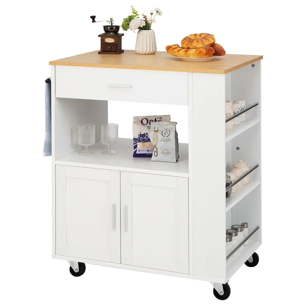 Ez a gurulós konyhasziget tökéletes választás azoknak, akik rendszerezni szeretnék a konyhai eszközöket és fűszereket. A tárolókocsi praktikus fiókkal, polcokkal és három fűszertartóval segíti a rendszerezést, miközben mobilitásának köszönhetően bárhol könnyedén használható.