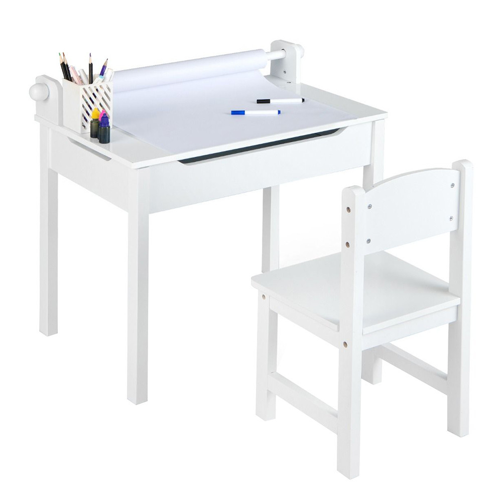 A készlethez papírtekercs, papírtartó és két marker is tartozik, így a gyerekek azonnal elkezdhetik a rajzolást, festést vagy egyéb kreatív tevékenységet. Az asztal tökéletes helyet kínál tanulásra, kézműveskedésre, olvasásra és étkezésre is. Az asztal lapja felhajtható, alatta tágas tárolórekesz található, ahol elférnek a ceruzák, könyvek, festékek és egyéb eszközök. A felnyitható fedél bármely pozícióban rögzíthető, így a gyermek biztonságosan és kényelmesen használhatja a tárolót.