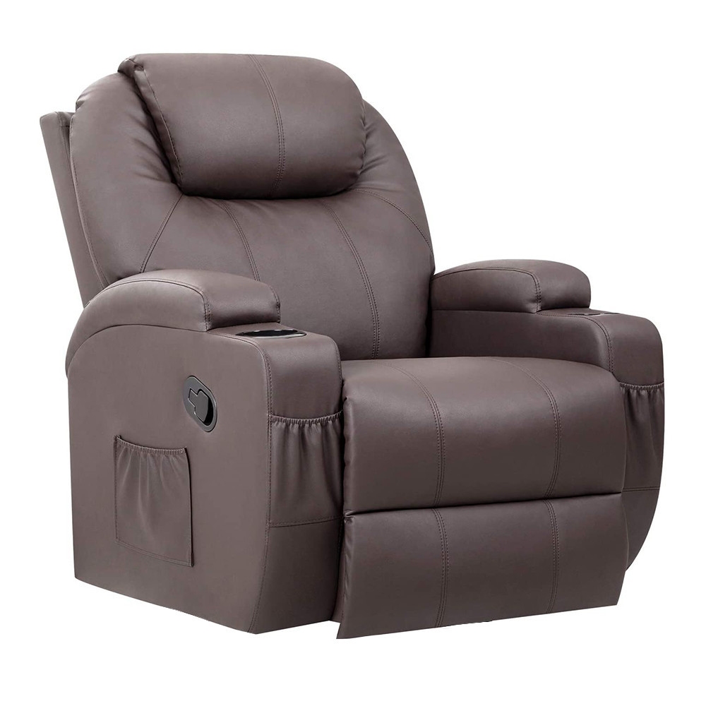 A fotel barna műbőr kárpitja stílusos megjelenést kölcsönöz bármely nappalinak, ráadásul könnyen tisztán tartható. A karfákban található pohártartók és az oldalsó zsebek extra kényelmet nyújtanak – tökéletes hely a kedvenc könyvednek, magazinodnak vagy a TV távirányítónak.