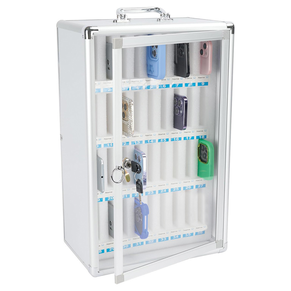 Masszív, szivacsos belsejű mobiltelefon széf kulcsos zárral, amely ideális választás irodák, iskolák vagy rendezvények számára, ahol több készülék biztonságos és átlátható tárolására van szükség. Különböző kapacitásban elérhető, jól rendszerezhető és strapabíró megoldás.