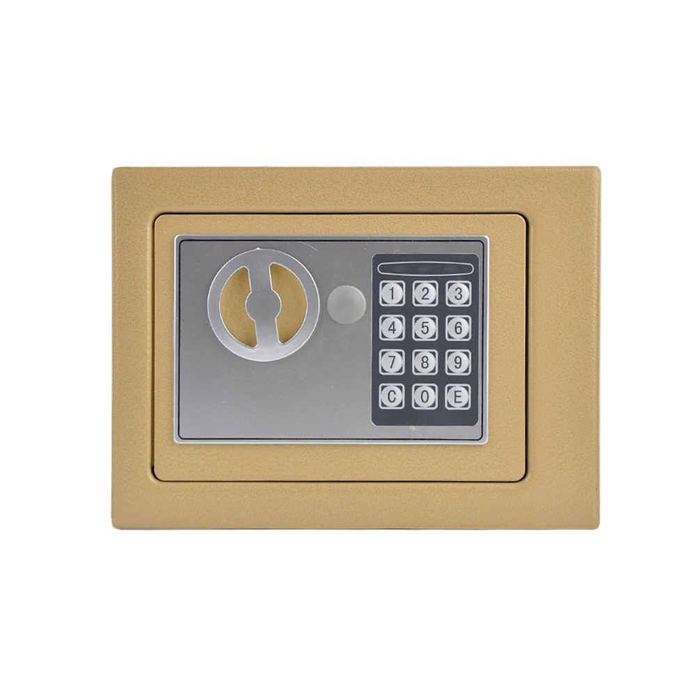 Ez az arany színű, kompakt széf ideális megoldást kínál otthoni vagy irodai értéktárgyak biztonságos tárolására. Digitális kódos vagy kulcsos nyitási lehetőségével kényelmes használatot biztosít, miközben elegáns megjelenése jól illeszkedik bármilyen környezetbe. Kis mérete ellenére meglepően tágas, és akár készpénz, ékszer vagy dokumentumok is biztonságban tarthatók benne.