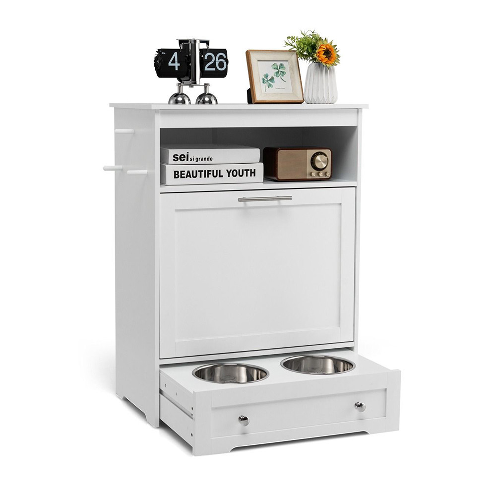 A felső munkalap és a nyitott rekesz ideális a gyakran használt kellékek, dekorációk vagy könyvek elhelyezésére. A középső, billenős ajtóval ellátott tárolószekrény pedig diszkrét helyet biztosít tápnak, játékoknak, keféknek és egyéb kisállat-kiegészítőknek.