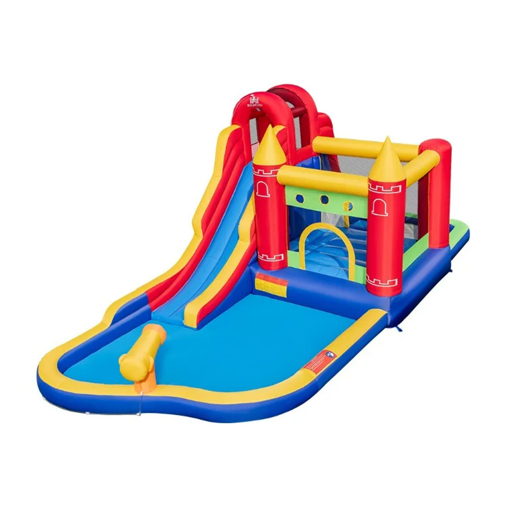 A felfújható játszóvárban összesen kilenc különféle játéklehetőség kapott helyet: medence vízágyúval, csúszda, mászófal, trambulin, labdamedence, célbadobós játék, karikadobás, kosárlabda-karika és bokszcélpont. A mellékelt színes labdák tovább fokozzák a játékélményt, és még több lehetőséget kínálnak a mozgásra és együttjátszásra.
