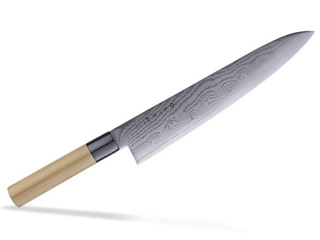 Tojiro Shippu Damascus Gyuto 27 cm FD-596 Szakácskés. A Tojiro Shippu FD-596 egy Gyuto típusú japán konyhakés – nagy szakácskés, 27 cm hosszú, damaszkuszi acél pengével, VG-10 rozsdamentes acél maggal.