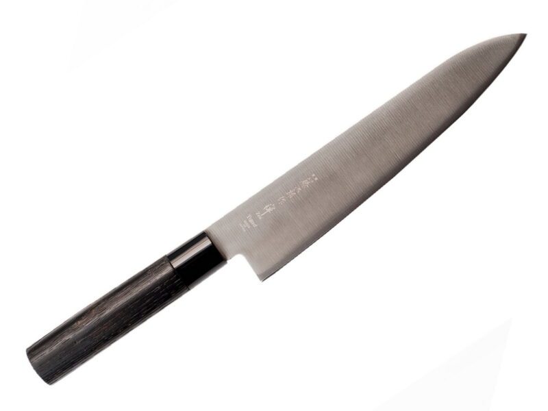 Tojiro Zen Black Gyuto 24 cm FD-1565 szakácskés. A Tojiro Zen Black FD-1565 egy Gyuto típusú japán konyhakés – nagy szakácskés, 24 cm hosszú, laminált rozsdamentes acél pengével, VG-10 rozsdamentes acél maggal.